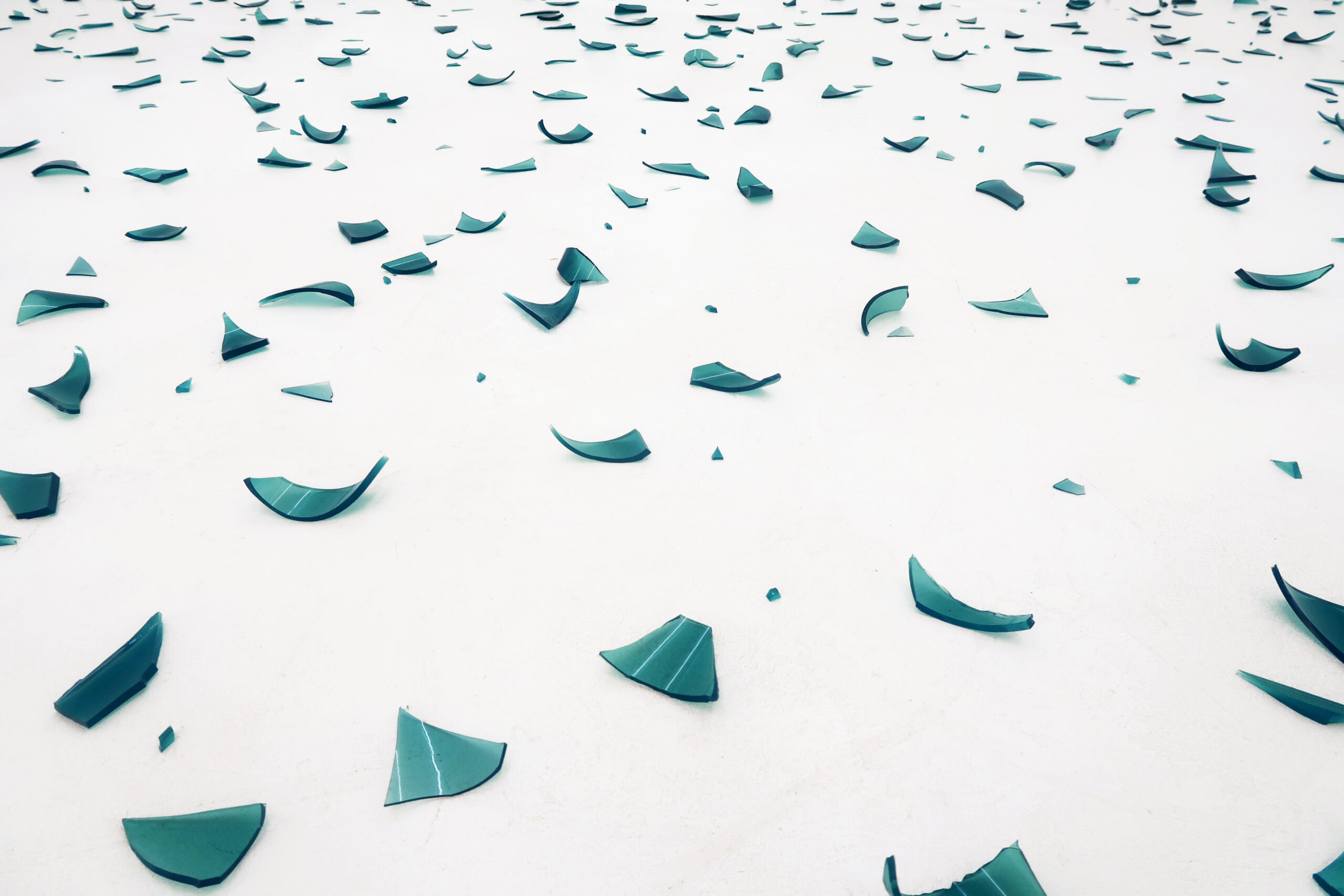 Fotografia a mezzo busto di una donna giovane, distesa su una superficie, i suoi capelli sono castani e i suoi occhi sono chiari. Guarda fissa sull'obiettivo e dei coriandoli blu semi-trasparenti le cadono sul volto.